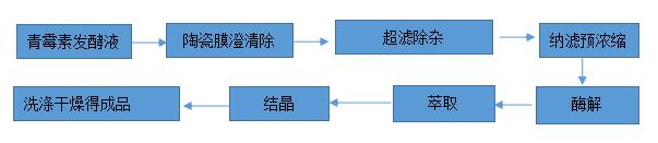 我國(guó)是世界最大的青霉素生產(chǎn)基地之一,6-APA是最重要的半合成抗生素原料,通常由青霉素工業(yè)鉀鹽經(jīng)酶裂解制得。針對(duì)青霉素料液熱敏、極易降解、發(fā)酵液固含量高、分離難度等特點(diǎn),廈門福美科技有限公司采用陶瓷膜+卷式超濾+卷式納濾濃縮的全膜法組合技術(shù)工藝,配合酶解工藝由青霉素直通6-APA,全面改進(jìn)6-APA的生產(chǎn)工藝。工藝流程如下圖所示: