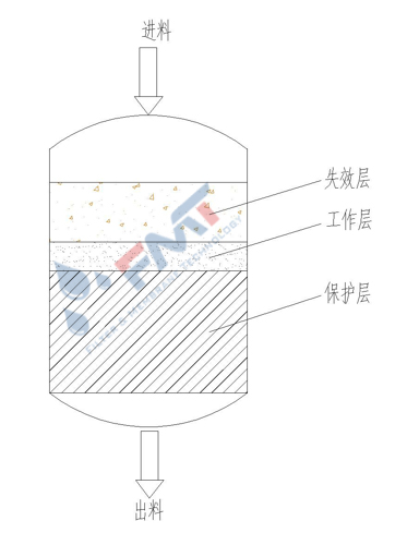 離子交換技術(shù)是基于樹脂功能基團與物料中特定離子的吸附作用進行的交換過程,離子交換是可逆的等當量交換反應(yīng)。傳統(tǒng)的離子交換應(yīng)用時采用固定床實現(xiàn)的,我們對固定床的工作過程進行分析發(fā)現(xiàn),在交換過程中樹脂床將分為三段,即飽和區(qū)、活性區(qū)(傳質(zhì)區(qū))和新鮮樹脂區(qū)。隨著交換進行,傳質(zhì)區(qū)不斷下移直至底部交換完全。整個過程只有傳質(zhì)區(qū)處于工作狀態(tài),飽和區(qū)和新鮮樹脂區(qū)閑置,因此樹脂利用率低。